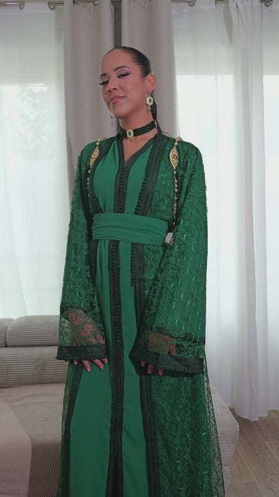 The bridal takchita is distinguished by its delicate lace and silky satin , perfect for a refined ceremony. Its fitted belt slims the waist while the tone-on-tone embroidery and discreet finishes add a touch of elegance. Declined here in royal green , it reflects the richness of Moroccan craftsmanship and the modernity of a modern wedding.